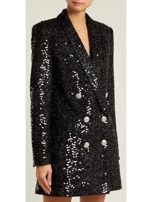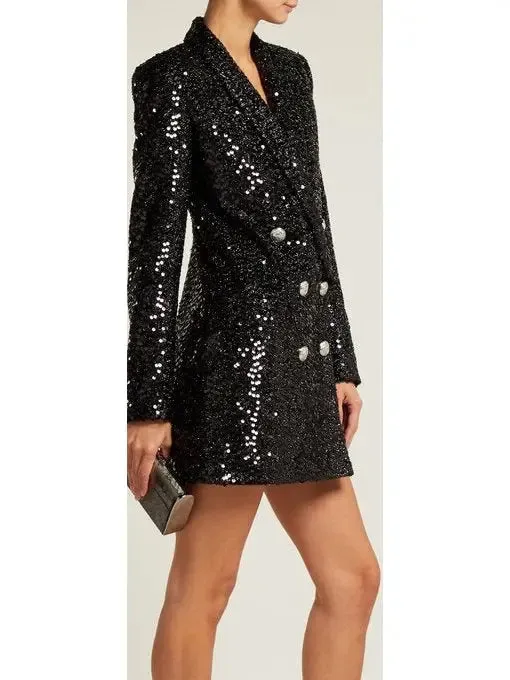 Part of our Coats & Jackets collection, the Double-Breasted Long Sequin Blazer in Black is truly a luxury addition to any lady's wardrobe here at Branna Couture. Designed with the highest degree of attention to detail and quality in mind, we are confident you'll adore this piece.