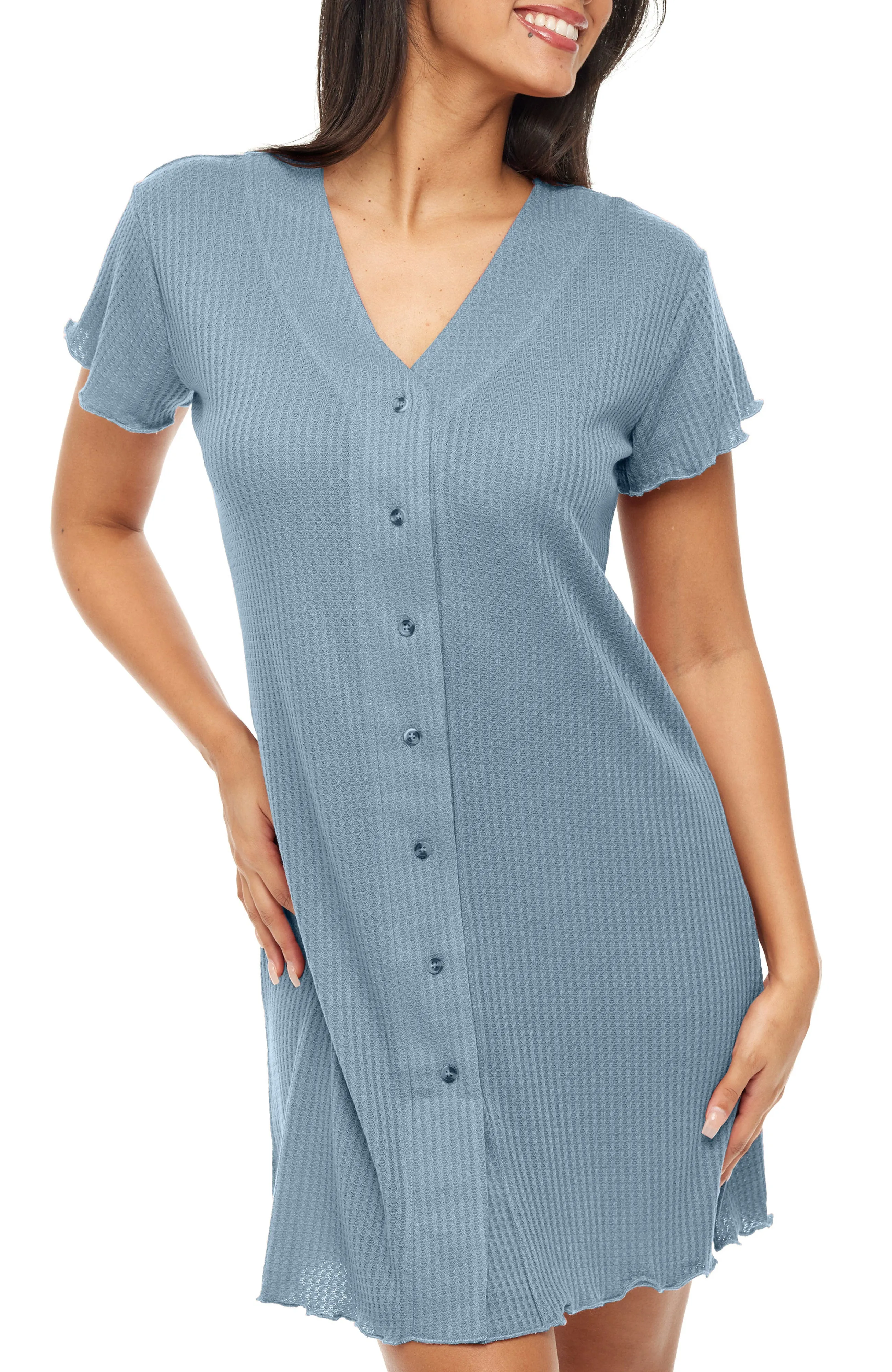 This ribbed, waffle knit nightshirt for women from Alexander Del Rossa is cozy, resilient, and stylish. Manufactured from a high-grade, ribbed fabric that is light, soft, and durable. The ribbed fabric will not shrink, making it a reliable choice for loungewear. The colors have undergone rigorous testing and are proven not to bleed. Key features include a deep v-neck cut, fashioned in the same ribbed style, along with a full button-up front for easy access. The short sleeves, crafted from the same ribbed material, sport wavy lettuce hems, adding a unique touch to this garment. The length of this nightshirt is designed to sit above the knee, culminating in a wavy lettuce hem, mimicking the sleeve design. All these features are accented with the ribbed texture of the fabric, making this nightshirt a perfect blend of comfort and elegance. Experience the pleasure of ribbed comfort with this soft, waffle knit nightshirt from Alexander Del Rossa.